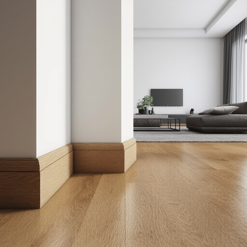 การซ่อนรอยตำหนิ: รอยต่อระหว่างผนังและพื้นมักจะไม่ตรงหรือเรียบเสมอกัน อาจมีช่องว่างเล็กน้อย ปูนปลาสเตอร์ที่ไม่สม่ำเสมอ หรือความแตกต่างของความสูงของพื้น บัวเชิงผนังช่วยซ่อนรอยตำหนิเหล่านี้ได้อย่างมีประสิทธิภาพ สร้างการเปลี่ยนแปลงที่สะอาดและราบรื่นระหว่างพื้นผิวทั้งสอง มันซ่อนขอบดิบของวัสดุปูพื้น ทำให้ดูเรียบร้อยและสวยงาม นี่เป็นสิ่งสำคัญอย่างยิ่งสำหรับพื้นลอย เช่น ลามิเนตหรือไม้เอ็นจิเนียร์ ซึ่งต้องมีช่องว่างการขยายตัวรอบปริมณฑล บัวเชิงผนังปิดช่องว่างนี้อย่างเรียบร้อย ป้องกันฝุ่นและเศษผงสะสม และช่วยให้พื้นเคลื่อนที่ได้ตามต้องการ